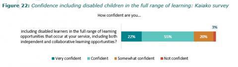 - Kaiako are not confident teaching disabled children, and struggle to access support to help them develop. Kaiako confidence in teaching disabled children is low. A third of kaiako do not feel confident enough to deliver a curriculum that is inclusive of disabled children. Targeted professional learning and development, and experience supporting disabled children, improves kaiako confidence. Accessing development and capability-building support is an ongoing challenge.