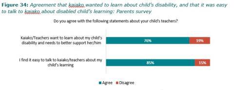 Figure 34: Agreement that kaiako wanted to learn about childâs disability, and that it was easy to talk to kaiako about disabled childâs learning: Parents survey