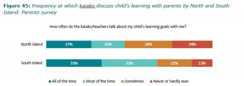 Figure 45: Frequency at which kaiako discuss childâs learning with parents by North and South Island: Parents survey