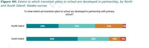 Figure 44: Extent to which transition plans to school are developed in partnership, by North and South Island: Kaiako survey