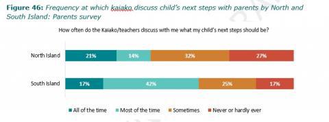 Figure 46: Frequency at which kaiako discuss childâs next steps with parents by North and South Island: Parents survey