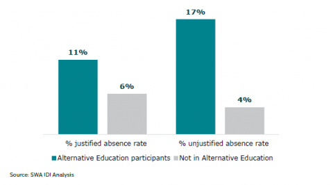 Figure 14:Â Justified and unjustified absence rates: Alternative Education participants and young people not in Alternative Education