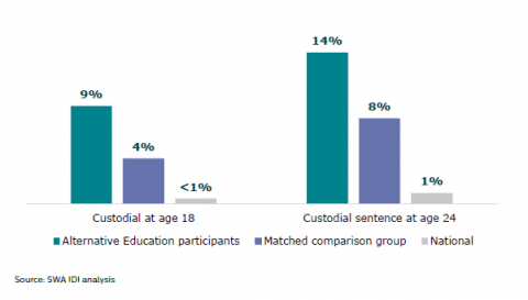Figure 28:Â Custodial sentence: Alternative Education participants, matched comparison group and national figures