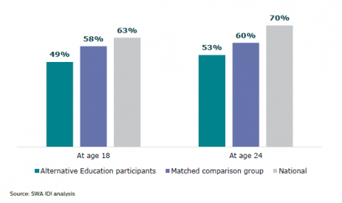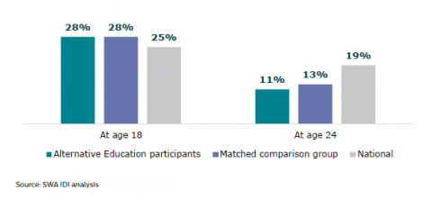 Figure 24:Â Participation in tertiary education: Alternative Education participants, matched comparison group, and national figures