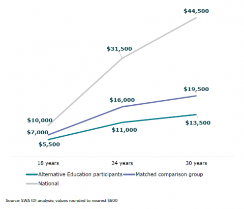 Figure 26:Â Income from wages: Alternative Education participants, matched comparison group and national values