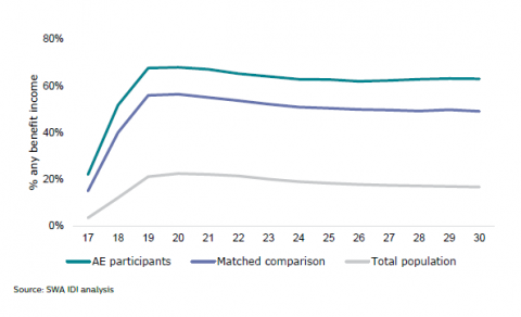 - describing the future outcomes and activities (age 17 to 30) of people who previously participated in Alternative Education, compared to the matched comparison group and the overall population