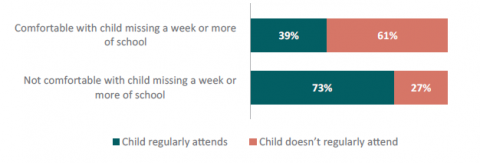 For parents who are comfortable with their child missing a week or more of school, thirty nine percent had children who regularly attend school, while sixty one percent had children who didnât regularly attend school.