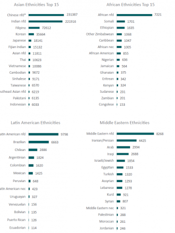 There are many forms of diversity including, among others, ethnic, cultural, language, gender, sexual identity, and religious diversity. For this study we focus on ethnic diversity and associated language, cultural, and religious diversity. Ethnicity is defined as the ethnic groups that people identify with or feel they belong to. Ethnic communities included in this report are African, Asian, Latin American, and Middle Eastern.Â