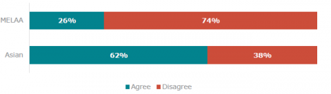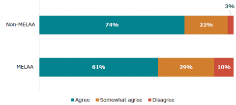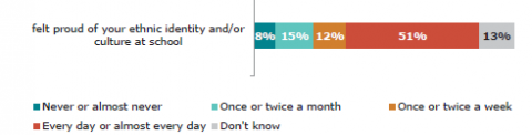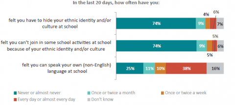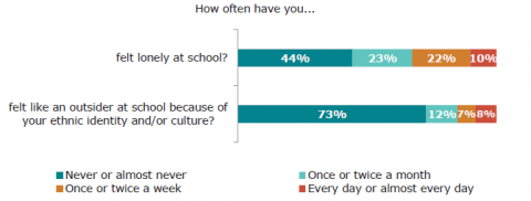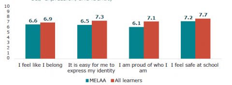 Nearly one in five learners from ethnic communities reported they frequently feel they do not belong and a third feel lonely at school every week or every day. Nearly one in five also feel they have to hide their ethnic identity at school or feel excluded from activities because of their ethnic identity. MELAA learners in particular have very low wellbeing.
