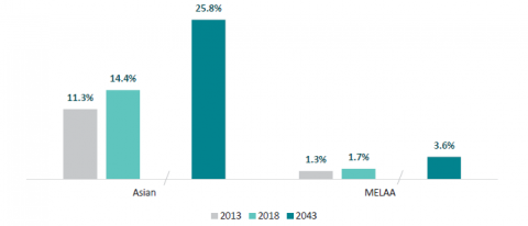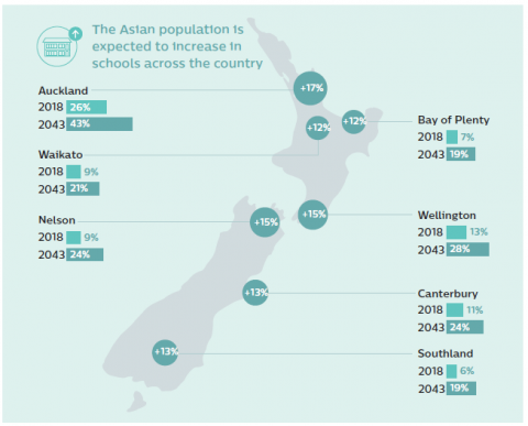 Diversity is increasing across the country, but most rapidly in urban areas. Learners will be from a wider range of ethnic communities. By 2043, it is expected just over one in four (26 percent) learners will identify as Asian and around one in 20 (3.6 percent) will identify as Middle Eastern, Latin American, or African (MELAA). In Auckland, more than two in five (43 percent) learners will identify as Asian.