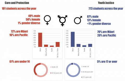 Oranga Tamariki can place children and young people in Care and Protection residences when it is deemed that the students would be at significant risk of harm in the community. Most of these students are aged between 10 and 13 years, and there is an even mix of male and female admissions, and a small number of non-binary students. The length of stay in Care and Protection is usually between four weeks and six months. Â