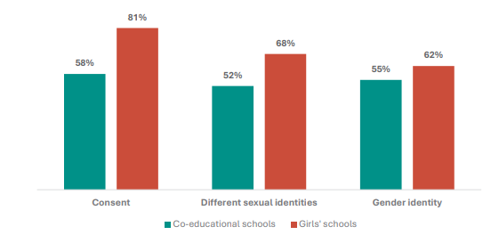- Students in girlsâ schools are more likely to learn about consent, different sexual identities, and gender identity than students at co-ed schools.Â