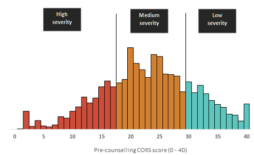 For this evaluation, students completed the CORS with the help of their counsellor during the first counselling session and again during the final counselling session. Â