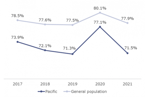 Pacific and general population NCEA Level 2 achievement 2017 to 2021