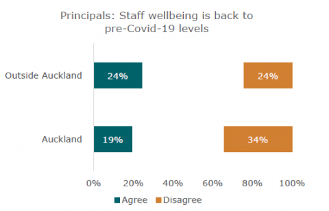 Both teachers and principals reported negative impacts on their wellbeing as a result of Covid-19 disruptions. Younger teachers and principals of smaller schools are more affected. This was evident in 2020 and has increased since. Teachers and principals were feeling less supported and connected at work, and around a quarter of principals overall reported that they needed more support for their wellbeing.