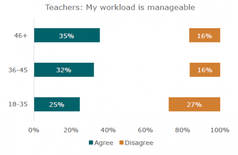 Younger teachers have struggled with their workload more than their older colleagues. A third (35 percent) of teachers aged 46 and above agreed that their workload was manageable, while only a quarter (25 percent) of 18-35 year old teachers agreed.