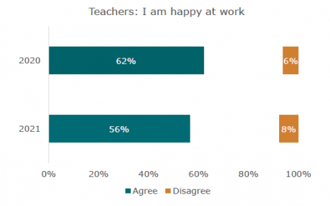 In June and July 2021, just over half (56 percent) of teachers reported that they were happy at work, a decline from about two thirds (62 percent) in September 2020. More than a quarter of principals (27 percent) reported that staff wellbeing had not returned to where it was before the Covid-19 disruptions.